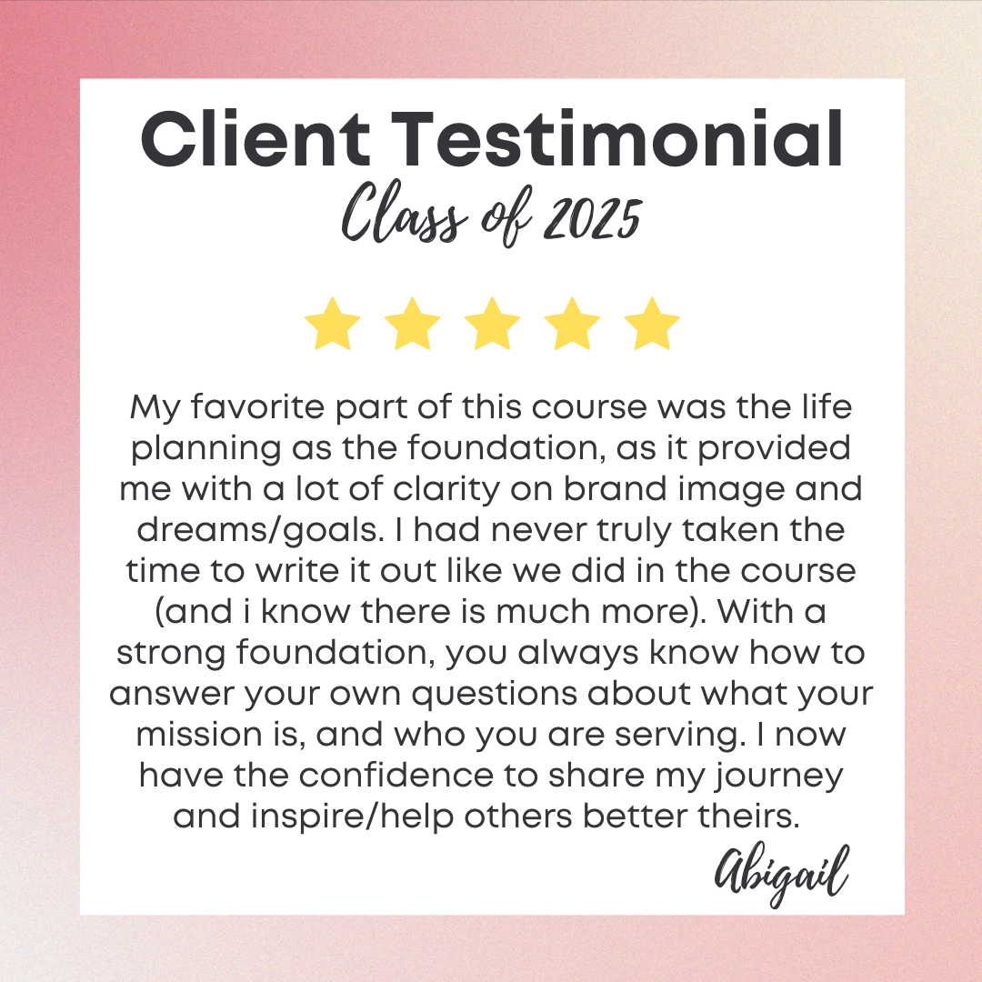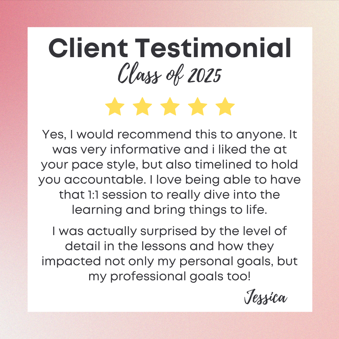 This course is semi self-paced with lesson video recordings released weekly and ONE private 1:1 coaching call. This gives you flexibility within the program, but also with the accountability of having a "due date" to complete & turn in assignments for feedback. You'll have 2 opportunities in 2026 to join this 6 week class -- the first class starts April 26 and the next will be late August!